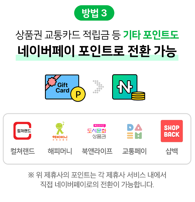 - 문화상품권 등 전환: 문화상품권, 해피머니, 도서문화 등의 상품권이나 적립금을 네이버페이로 전환하여 사용하세요.